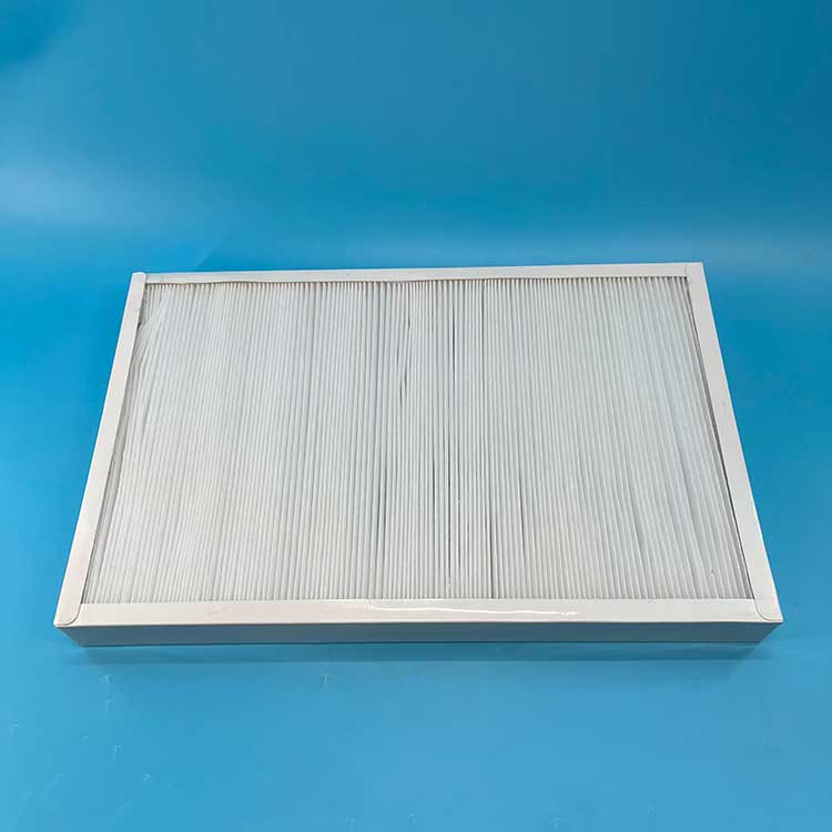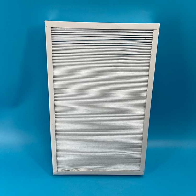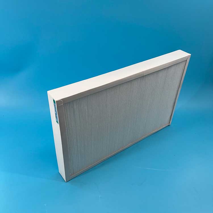 過濾材料是以折疊形式裝入高強度模切硬紙板內,迎風面積增大。流入的空氣中的塵埃粒子被過濾材料有效阻擋在褶與褶之間。潔凈空氣從另一面均勻流出,因此氣流通過過濾器是平緩和均勻的。視過濾材料不同,它所阻擋的粒徑從0.5μm到5μm而不同,過濾效率也不同 。
