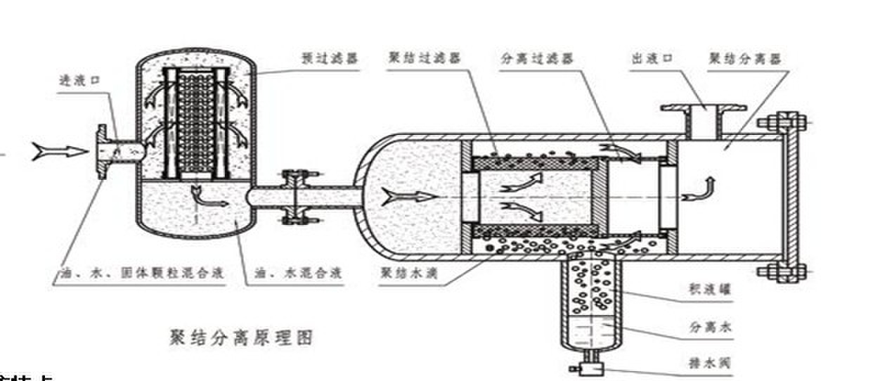 當(dāng)不同的混合液體流入分離器后,首先進(jìn)入聚結(jié)濾芯,聚結(jié)濾芯具有多層過(guò)濾介質(zhì),其孔徑逐層遞增。由于表面張力的差異,油液快速通過(guò)濾層,而水卻緩慢的多;又由于聚結(jié)濾芯采用親水性材料,微小的水滴更是吸附在濾層表面從而造成水滴的聚結(jié)。受動(dòng)能的作用,小液滴競(jìng)相通過(guò)開(kāi)孔,逐漸匯成大的液滴,并在重力作用下沉降而與油液分離,通過(guò)聚結(jié)濾芯后的油液,仍有尺寸較小的水珠在慣性作用下向前至分離濾芯處。分離濾芯由特殊的疏水材料制成,在油液通過(guò)分離濾芯時(shí),水珠被擋在分離濾芯的外面,而油液則通過(guò)分離濾芯,并從出口排出。